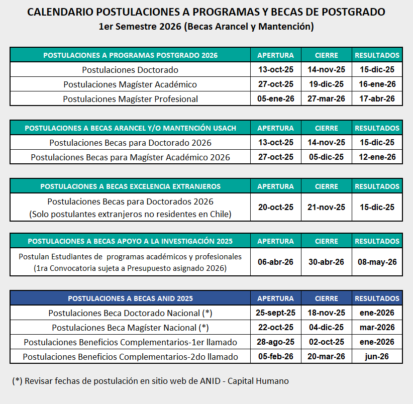 El Reglamento de Becas de Postgrado de la Universidad de Santiago de Chile, Resolución 7307/2022, señala que las y los estudiantes regulares de Postgrado (matriculados) -con base en sus antecedentes de excelencia académica-, podrán postular a los siguientes tipos de becas: