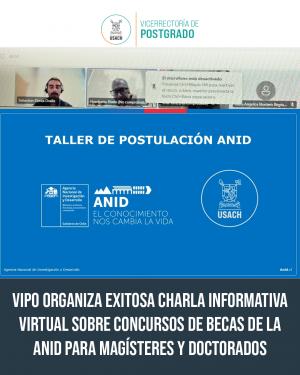 Con más de 250 personas participantes se desarrolló la charla informativa virtual sobre Concursos de Becas para Magísteres y Doctorados disponibles por parte de la Agencia Nacional de Investigación y Desarrollo (ANID), instancia coordinada entre la Vicerrectoría de Postgrado (VIPO) de la Universidad de Santiago de Chile en conjunto con la agencia estatal.